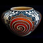 | ACOMA POTTERY Acoma Pueblo is one of the oldest continuously inhabited pueblos in the Southwest, situated on top of a massive sandstone mesa. Acoma is known for its light mineral clay, which when fired, makes hard, thin-walled vessels. The pottery is generally decorated with geometric patterns which represent natural elements such as rain, lightning, and clouds. Floral and animal or bird, particularly parrot effigies, are often used as well. The pueblo’s signature pottery piece is the large “olla” or large water jar. Double-spout “wedding vases” and double handle water “canteens” were also made quite often at Acoma. Acoma is unique in being one of the first pueblos to commercially produce pottery for sale to the public. Train depots built on Acoma land in the early 1880’s allowed travelers to buy pottery and other items. Since large pots were harder to pack and transport, smaller inexpensive pottery were made to sell to tourists. Most of the small pots had simple designs and were simply signed “Acoma” on the bottom. In the 1930’s, renowned potters, Lucy Lewis and Marie Chino, started a rebirth of interest in Acoma pottery. They both developed new abstract designs on their pottery, sometimes covering the entire surface, and began to sign their pieces. Lucy’s pottery included not only abstract patterns on a white slip, but the deer with heart line design she would become known for. Her children, Ann, Andrew, Emma, Dolores, and Carmel, become excellent potters as well. Marie’s daughters, Carrie, Rose, Grace, and son Gilbert, also become remarkable potters and carried on the Chino family tradition, passing it down to their children. Other noted award winning potters from Acoma include Lily Salvador, Frances Pino Torivio, Dorothy Torivio, known for her fine line geometric and abstract design pots, Barbara and Joseph Cerno, who are known for their huge polychrome (three or more colors) ollas with parrot and floral designs. Another outstanding potter is Rebecca Lucario, who makes her pots traditionally then paints complex designs in the “eye dazzler” style as well as a Mimbres revival style. Rachel Aragon is known for her large classic traditional polychrome ollas with bold geometric designs featuring stylized parrots, and Sandra Victorino is an award-winning potter who also makes large classic ollas with her own signature swirling bands of geometric designs. Loretta Joe is an outstanding potter who makes traditional large polychrome olla pots and paints them with beautiful floral, parrot, and geometric patterns. Another prominent potter is Theresa Garcia-Salvador, who specializes in hand-coiled, thin-walled Acoma water vessels. She gathers her own clay then mixes, coils, shapes, and hand paints her pottery using natural pigments with floral and parrot designs, and fires her pottery outdoors in the traditional manner. She also experiments with different designs she has seen on prehistoric pots. Her pot to the right features a prehistoric design called the “Tularosa Swirl.” |
