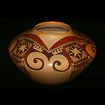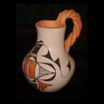 | JEMEZ POTTERY The history of pottery at Jemez Pueblo has been a troubled one, with long periods of absences in pottery making, then sudden rebirths of pottery production. Consequently, not much is known about Jemez pottery prior to the 1880’s. Although, some prehistoric black-on-white pottery pieces from the Jemez Mountains have been recovered. In the late 1920’s, then again in the 1960’s and 70’s, a revival effort was made with the production of small tourist pieces decorated with a water-based paint also known as “poster paint” with little success. Although many of these pieces appear crude compared to the finer pottery of other pueblos, they do represent a certain charm and style of their own. Due to the short period of time “poster paint pottery” was produced, they have become somewhat collectible. Most of these pieces were made as miniatures in the form of wedding vases, bowls, cups and saucers, canoes, salt/pepper shakers or animal effigies, and generally less than five inches in width or height. The Tesuque Pueblo also made some of this style of tourist pottery. The 1980’s brought about the most successful revival attempt by several families including the Frauga and Gachupin family. The Frauga family is leading the way in the production of fine pottery at Jemez. Award winning artist, Juanita Frauga, taught her son, Clifford, and daughters, Glendora Daubs, and Betty Jean Frauga, who are all award winning artists. Glendora is known for her exquisite, finely carved “sgraffito” pots. Rebecca Gachupin (Zia/Jemez), who was born at Zia, but also has family and lives at Jemez, is known for her unique creations by blending components of both Zia pottery and Jemez designs resulting in a sort of “hybrid” vessel. The 1980’s also brought about a renewed interest in finely carved ceramic “storytellers.” Jemez artists have taken the traditional storyteller to new heights literally by making them larger and with more children. The Sando family is well-known for their storyteller figures. Other unique forms have emerged more recently such as the horse storytellers made by the Tsosie family. Jemez potter, Verda Toledo, has developed a style uniquely her own. She has painstakingly researched and revived the prehistoric “Mimbres” designs and beautifully recreates them on her pottery bowls. He pots are quickly finding a market with collectors. Alvina Yepa is yet another award winning potter who has won numerous awards including First place and Best of Division at Santa Fe Indian Market. She has perfected her own style with a deep carved designs on her jars and vases. Fannie Loretto is an award winning artist who was the first to create clay masks, and is known for her beautiful, expressive clown masks. Her daughter, Kathleen Wall, is also an award winning artist, known for her creative large clay sculptures of clowns and pueblo women. Another Jemez artist who is now considered a master potter is Mary Small. She has also developed a style, uniquely her own, with her signature blue-gray slip. Her graceful lines and smooth innovative forms are commendable. Mary makes large beautiful pots and wedding vases graced with a signature piece of turquoise. She has also made large elaborate pots depicting miniature pueblo village scenes complete with doors, vigas, hornos, and kiva ladders. Mary has won many awards over the years, including First at Indian Market in Santa Fe, and was chosen artist of the year by the Indian Arts & Crafts Association in 2002. |