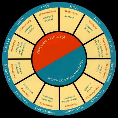 SEASONS The Hopi religious calendar begins anew each year in November with the Kelmuya season. Only those who have been initiated into "manhood" may participate in the ceremonies, which celebrate the creation of our present world, the Fourth World. Kelmuya (November) Fourth World Creation, Month of the Sparrow Hawk Kelmuya marks the beginning of the Hopi life cycle because it commemorates the start of the Fourth World—the world we live in today. In this month a young male is given a new path of life towards becoming a truly aligned Hopi person. The ceremony is sacred, therefore rituals are done secretly. The initiated society members prepare for the ceremony by purifying themselves to clear their thoughts. The ceremony is completed with a public dance in which people can offer silent prayers to supernatural beings. We also pray for all mankind that life will be pleasant, peaceful and everlasting. The fire of life is lit and the emergence from the underworld is remembered. We pray that we will continue to grow in this life. Some high priests who have completed their religious instruction are initiated and ordained into the spiritual leadership as well during Kelmuya. Kyaamuya (December) Winter Solstice Season, Month of Reverence After the emergence from the Third World to this present one, the keeper of the earth, Maasawu, warned us that in order to live on this earth and maintain sustainable living conditions, we must learn and practice how to pray and conduct ceremonies. During this time there is much respect paid to the spirit beings. Wise elders tell stories of the past that provide important moral guidance for maintaining the high standards of Hopi life. This is the only time we make requests for material goods. We observe the sunrise and moon around the winter solstice to set the time for the Soyal Ceremony, which confirms and begins the life plan for the year. The Soyal Ceremony is the second most sacred ritual for a healthy and successful life. Also during Kyaamuya, the first katsinam appear to promote the procreation of human life. Rituals in the kiva include silent prayers, fasting and eating sacred foods. Once the rituals have been completed, people begin preparing for the winter social dances. Paamuya (January) Winter Social Dances This month is reserved for winter social events. In the Paamuya dances we imitate animals that roam in the woods and mountains, which are now covered in snow. These dances represent prayers for snow on Hopi fields or for hunting. The Buffalo Dance is most often performed, including Hopi and other Pueblo versions. The dances are held in the kiva or in peoples' homes at night or in the plaza during the day. This month is specifically set aside to rid our lives of the crazy emotions and be joyful in an outrageously loud manner. We do this to eradicate all the wildness we have in ourselves in order to prepare for the solemn religious ceremony that follows in February. Powamuya (February) Purification Month After the period of excessive joyful fun, mortals are now ready to accept the spirits, the katsinam. Powamuya is the most complex Hopi ceremony. The initiated men pray to the katsinam to appear among us so that all humans may continue to grow and mature. The ceremony begins when a katsina high priest—the Ahöla—comes at sunrise to bless all the houses. He "opens" the kiva so that the divine katsinam will visit. Whipper katsinam travel the villages at night to see whether the people have maintained the Hopi standards of good conduct. These katsinam whip the young children to purify them or introduce them to the spirit beings. Then the children are taught respect for the spirit beings and learn the katsina beliefs. If and when there is disobedience, there are bitter consequences: hard whippings by the katsinam. Whipper katsinam come with yucca branches as their weapons. In a severe case of disobedience, the jumping cholla cactus might be used. Men perform rituals in the kivas in preparation for the dance day. On that day, other katsinam appear at sunrise with beautiful gifts for the people, including a small bundle of bean sprouts, whose miraculous appearance in the middle of winter suggests that crops (food) will be plentiful in the coming season. Children who have behaved well and listened to the teachings of the katsinam are given many traditional gifts such as dolls, rattles and moccasins. Then the mean ogre katsina spirit—a female—comes to remove the last doubts and continue purifying the people. They demand that the women make a lot of special, sacred food for them that is really hard to prepare or takes a lot of time. If we do not bring enough food, the ogres say they will come and eat the children! The peacefulness of the village is shattered, and the night is filled with strange and terrifying hoots and snarls. Everyone looks inside themselves to see what they may have done wrong during the year to bring these terrible ogres here. At each house and kiva, everyone is loudly and publicly ridiculed for not living up to the high standards of Hopi life. Once these punishments are over, a special blessing is given to everyone by the kiva men and a social dance is held to heal things. The ogre family is forced out of the village. Ösömuya (March) Katsina Night Dances, Month of the Wind During this season, the katsinam perform beautiful dances at night in the villages to create a pleasant environment for all life forms so that they will grow and so that rain will come to nourish the crops. The katsinam are always watching and listening for humble prayers and meditations during the Night Dance season, which lasts from now until some time in July. Angk'wa means "appearance afterwards," and it is a series of these night dances performed during this period. On a certain night when the people have entered the kiva and are waiting, the katsinam suddenly appear on the roofs of the kiva and announce their arrival with pleasant sounds. The kiva chief