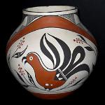 ACOMA POTTERY Acoma Pueblo is one of the oldest continuously inhabited pueblos in the Southwest, situated on top of a massive sandstone mesa. Acoma is known for its light mineral clay, which when fired, makes hard, thin-walled vessels. The pottery is generally decorated with geometric patterns which represent natural elements such as rain, lightning, and clouds. Floral and animal or bird, particularly parrot effigies, are often used as well. The pueblo’s signature pottery piece is the large “olla” or large water jar. Double-spout “wedding vases” and double handle water “canteens” were also made quite often at Acoma. Acoma is unique in being one of the first pueblos to commercially produce pottery for sale to the public. Train depots built on Acoma land in the early 1880’s allowed travelers to buy pottery and other items. Since large pots were harder to pack and transport, smaller inexpensive pottery were made to sell to tourists. Most of the small pots had simple designs and were simply signed “Acoma” on the bottom. In the 1930’s, renowned potters, Lucy Lewis and Marie Chino, started a rebirth of interest in Acoma pottery. They both developed new abstract designs on their pottery, sometimes covering the entire surface, and began to sign their pieces. Lucy’s pottery included not only abstract patterns on a white slip, but the deer with heart line design she would become known for. Her children, Ann, Andrew, Emma, Dolores, and Carmel, become excellent potters as well. Marie’s daughters, Carrie, Rose, Grace, and son Gilbert, also become remarkable potters and carried on the Chino family tradition, passing it down to their children. Other noted award winning potters from Acoma include Lily Salvador, Frances Pino Torivio, Dorothy Torivio, known for her fine line geometric and abstract design pots, Barbara and Joseph Cerno, who are known for their huge polychrome (three or more colors) ollas with parrot and floral designs. Another outstanding potter is Rebecca Lucario, who makes her pots traditionally then paints complex designs in the “eye dazzler” style as well as a Mimbres revival style. Rachel Aragon is known for her large classic traditional polychrome ollas with bold geometric designs featuring stylized parrots, and Sandra Victorino is an award-winning potter who also makes large classic ollas with her own signature swirling bands of geometric designs. Loretta Joe is an outstanding potter who makes traditional large polychrome olla pots and paints them with beautiful floral, parrot, and geometric patterns. Another prominent potter is Theresa Garcia-Salvador, who specializes in hand-coiled, thin-walled Acoma water vessels. She gathers her own clay then mixes, coils, shapes, and hand paints her pottery using natural pigments with floral and parrot designs, and fires her pottery outdoors in the traditional manner. She also experiments with different designs she has seen on prehistoric pots. Her pot to the right features a prehistoric design called the “Tularosa Swirl.” |