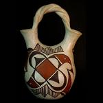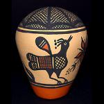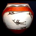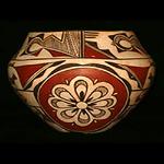 | ZIA POTTERY Zia Pueblo is considered one of the most beautiful among the pueblos of the Southwest, situated in the majestic mountains slopes and canyons of the Sierra Nacimiento Mountains. The gently sloping flood plain of the Jemez River, and the large Pajarito and Jemez Plateaus create the panorama for the Zia Pueblo. For over six hundred years the pueblo has survived the conflicts of man and nature including the Pueblo Revolt of 1680 when over six hundred people lost their lives. Since the turn of the century, Zia has been known for the production of beautiful polychrome pottery. Zia pottery is unique and immediately distinguishable from other pueblo pottery by their use of flowing floral and rainbow designs, including the sun symbol, now used as the New Mexico state flag along with the unmistakable image of the New Mexico state bird, the Roadrunner. The pottery can also be identified by its granular texture tempered with black flecks of basalt. The slip colors are usually shades of cream, brown, and red. The Roadrunner image is sometimes painted in various stages of walking, hopping, running, or even sliding to a sudden halt, and each potter has their own version of it. Zia pottery has been dominated over the years by the Pino, Toribio, Gachupin, and Medina families. Some of the most celebrated early Zia potters over the years were Isabel Toribio, Dominguita Pino, Ascension Galvin Pino, Dolorita Pino, Vicentita Pino, Candelaria Gachupin, Helen Gachupin, Trinidad Medina, Katherine Pino, Eusebia Shije, and Seferina Bell. Seferina’s daughters Ruby Panana and Eleanor Pino-Griego, are now both awarding winner potters. Eusebia Shije is known for her beautiful well-painted and highly polished traditional pots. She was the recipient of past awards which included best traditional pottery and overall excellence in traditional Zia pottery. Master potter, Sofia Medina, is the most recent matriarch of Zia pottery, who recently passed away. Her son Marcellus and his wife Elizabeth Medina, are known for their unique pottery--he paints dancers on his pots and Elizabeth developed her distinctive lidded Zia pot lid adorned with a ceramic turtle. Irene Herrera is another award-winning potter worthy of mention. Irene is known for her unique terraced kiva-stair shaped handles on her wedding vases. Contemporary potter Leonore Toribio, although born and raised at Zia Pueblo, married and moved from the pueblo to Oklahoma. Leonore’s story is very unique. She continues to make pottery in the traditional forms along with hand-painted Zia designs such as roadrunners, flowers and geometric designs. And, although she has fired outdoors, the Oklahoma wind and weather makes it very difficult. She has resorted to using an indoor kiln to fire her pottery, and has had to use commercial clay when she is unable to gather clay on her return trips home to Zia. To add to the degree of difficulty of pottery making and firing, Leonore lost one of her hands, but continues to form and paint her own pots one-handed. She even glazes some of her bowls so that they may be functional in holding food items such as fruit. |