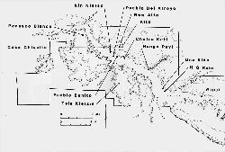 | Anasazi people began as nomadic basket makers until circa 700 a.d., when they became sedentary, living in towns of stone and adobe apartments with central plazas in the four corners region (area 3). Agriculture, with irrigation techniques, was practiced until circa 1275 when severe droughts caused migration to the Rio Grande. Here, Pueblos (village, sp) were established and flourished until the arrival in 1540 of Francisco Vasquez de Coronado. |
