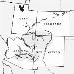 | Southwestern Native America includes Arizona, New Mexico, southern Colorado, and the northern Mexican states of Sonora and Chihuahua. Circa 300 b.c.e, Mexican culture called the Hohokam appeared in area 1 (see map above) of southern Arizona based on agriculture with irrigated field technology |